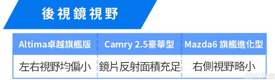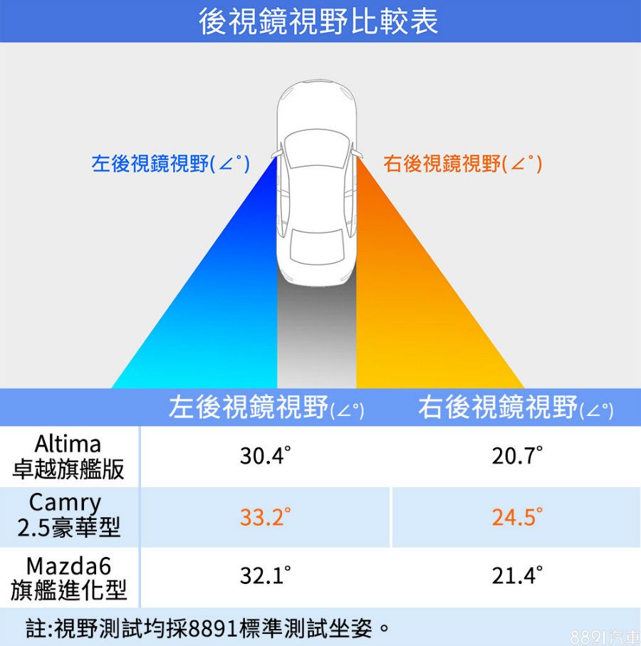 Camry後視鏡片採六角造型,且外側具備廣角設計,這讓兩側視野優於另外兩輛競爭對手,而Altima由於後視鏡反射面積較小,實測照射角度較為不足,在變換車道時得多看幾眼並借助盲點偵測系統輔助,必須多多留心才是。