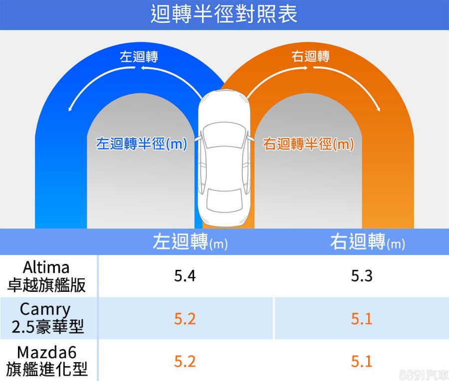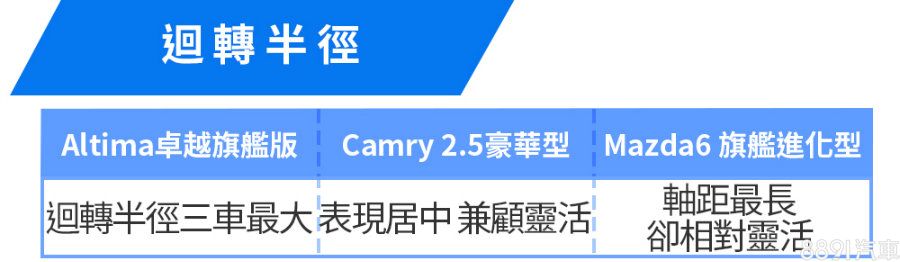 迴轉半徑與軸距長短息息相關,中大型房車軸距突破2.8m如今已成為基本,Mazda6軸距達2830mm為三車之最,但迴轉半徑卻能控制在5m出頭,反倒Altima以2825mm軸距、迴轉半徑來到5.3、5.4m略遜一籌。但平心而論,車長逼近4.9m的中大型房車無論如何都與靈活、刁鑽無緣,若停車環境、住家道路較為狹窄,還真的得多注意一些。