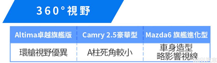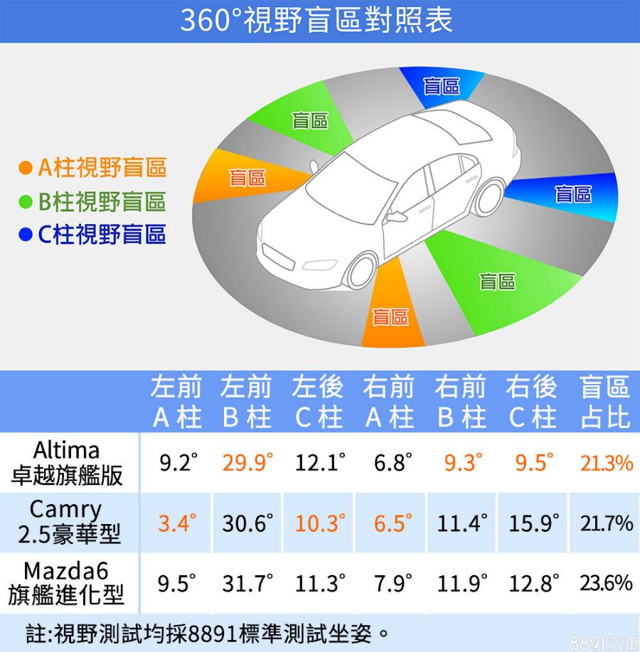 Altima動感車身造型讓他在前後視野表現並不理想,但在環艙視野方面則受惠於A、B、C柱造型較為纖細,盲區占比僅21.3%,對於掌握車身周遭情況有很大的幫助。Mazda6則主要在兩側B柱遮擋視線較多,盲區占比為23.%,然而根據過往超級測試經驗,三車還景視野都屬良好,並沒有顯著不足之處。