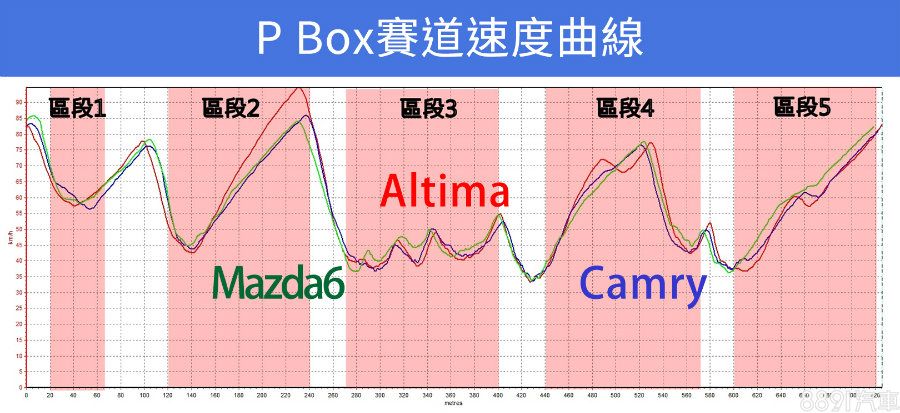 區段3:接下來是一連串的左右彎,雖然三條曲線上下交錯,但基本上可以看出Mazda6是最快的,Altima與Camry大約伯仲之間。