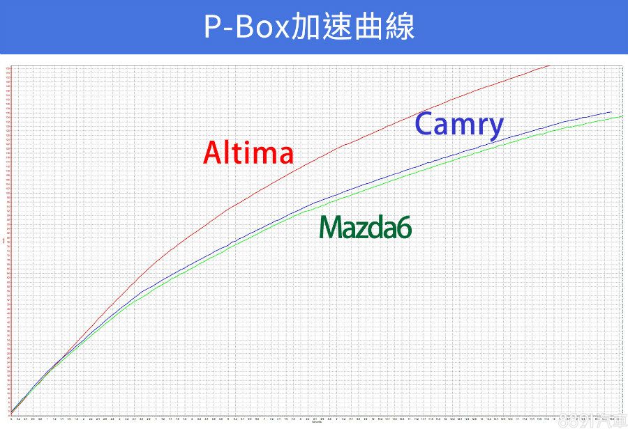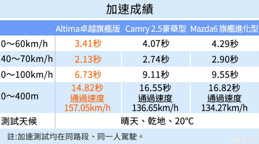 觀察加速曲線,起步當下三車算是齊頭並進,Altima稍稍受到CVT變速箱拖累,並無法在起步取得優勢,而隨著轉速攀升直奔動力精華帶,Altima便開始逐步擴大兩車的差距,最終以157km/h車速通過0~400m測試終點。Camry與Mazda6則一路保持著微幅差距,最終分別以136.6km/h、134.2km/h的車速完成測試。