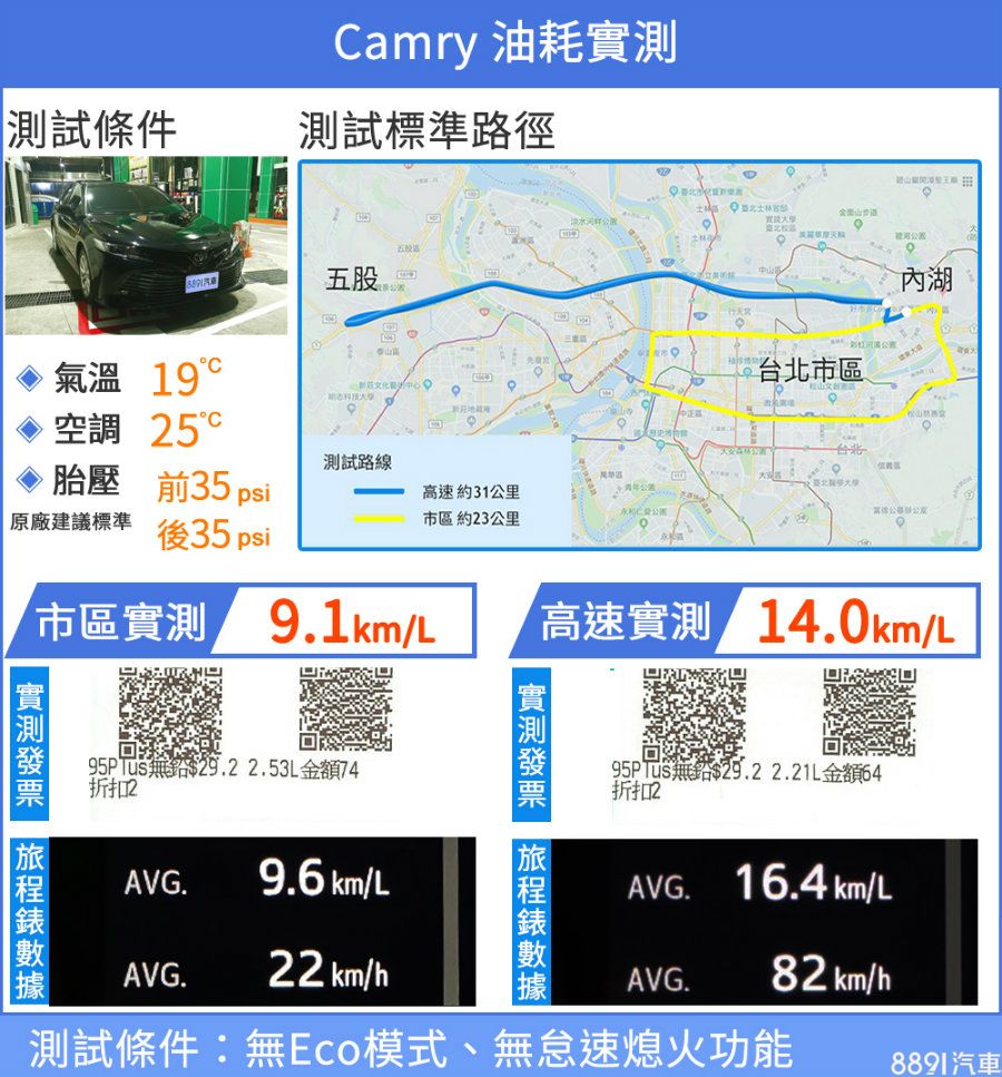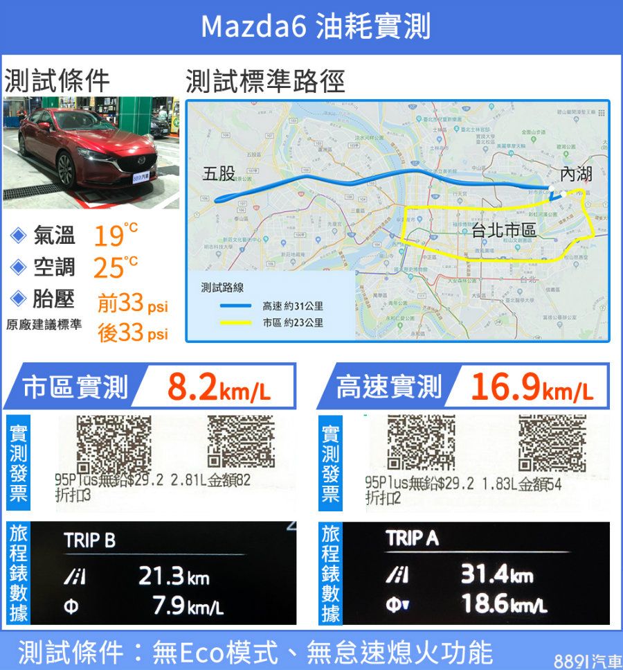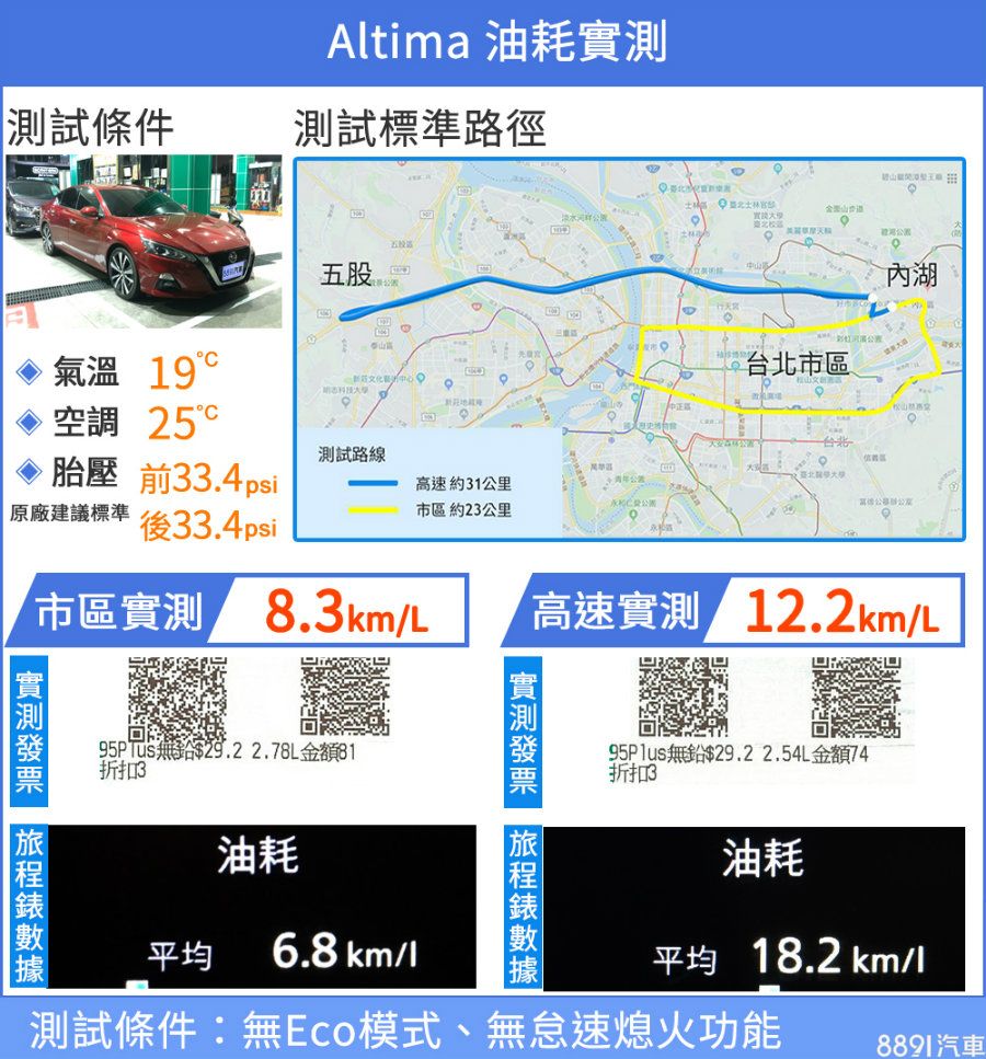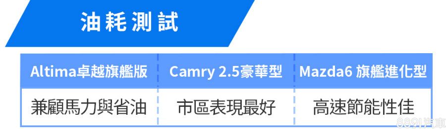 本回油耗測試在市區路段遭遇封路活動,從環河北路到民權大橋之間都是極為壅塞的路況,而高速部分雖然不至於走走停停,屬於車稍多、無法隨時保持最高速限的巡航狀態,以Altima來說,市區雖然很塞,實測卻拿下8.3km/L的不錯成績,而高速路段則是12.2km/L,和旅程電腦數據有段差距,並且在三車中居末。在三車都沒有怠速熄火功能的條件下,Camry以2.5升NA動力搭配六速自排,在調校上屬節能、線性設定,在市區路段取得最省油的實測成績,高速部分則由Mazda6繳出16.9km/L的最佳成績,這具Skyactiv-G引擎雖然已經推出好一段時間,但節能性依然不差。