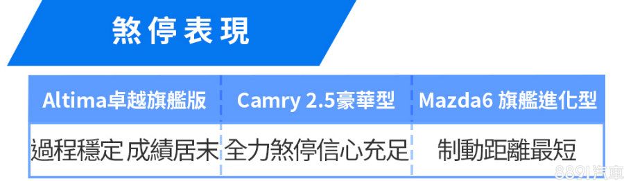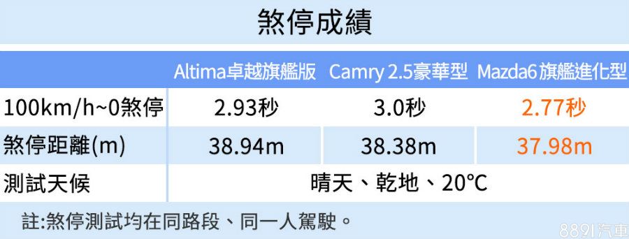 三車車重相仿、車格定位也完全相同的前提下,煞停測試成績沒有太明顯的差異算是可以預期的狀況,測試中成績最好的Mazda6與末位Altima煞停距離僅有不到1m的差距,表現算是平起平坐,顯然 Altima寬達235mm的配胎在這項測試中並沒佔到多少優勢。