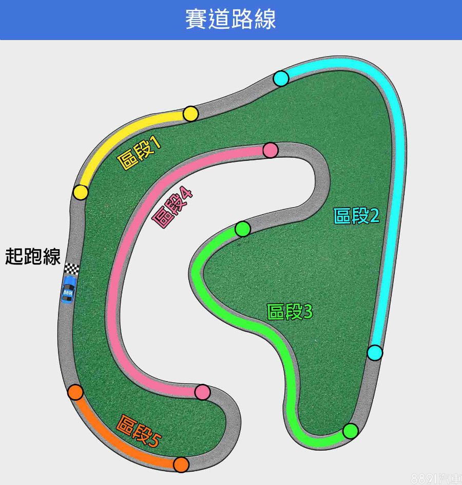 這是跑道路線圖,總長約720m,比起大魯閣卡丁場,這裡賽道較大、較寬,彎道變化性也較多一些,不過柏油路面的摩擦力較低。