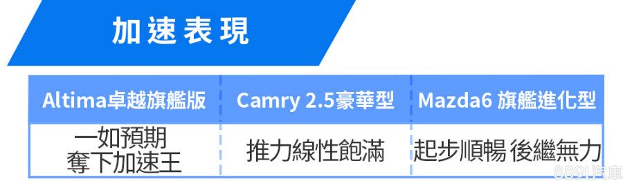 不難看出Altima憑藉著248hp馬力在加速實測中全面領先,0~100km/h僅需6.73秒,一輛六秒台的中大型房車無疑是Altima最具性能色彩的部分;其次排氣量達2.5升、自然進氣動力的Camry表現也不賴,0~100km/h需時9.11秒顯然不算太遜色,但最讓人驚豔的莫過於Mazda6,在動力、車重都居於劣勢的情況下依然跑出9.55秒百公里加速,相信已符合多數消費者的日常需求。