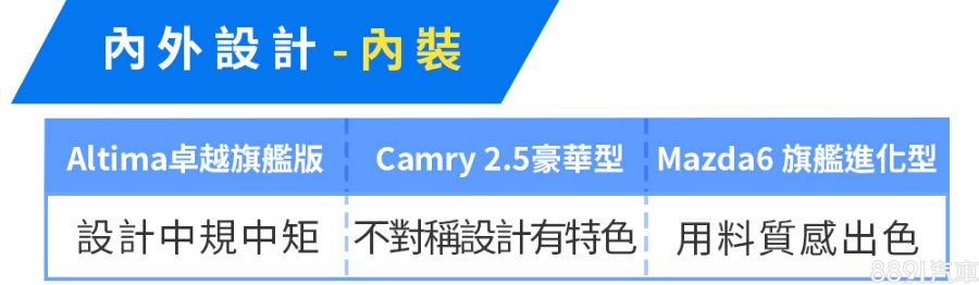新世代Camry流線又年輕,尤其是下氣壩造型,張力十足,擺脫過往那老實、熟齡專屬的平實扮相。燈具也符合時下科技,LED頭燈配有AHB自動遠光功能,鹵素方向燈位於燈組內側,整體簡單辨識度高,卻也相當契合外觀設計;車尾部分不若另外兩車有雙出尾管,不主張性能氛圍,但整體曲線豐富,加上LED尾燈,視覺仍大氣好看。