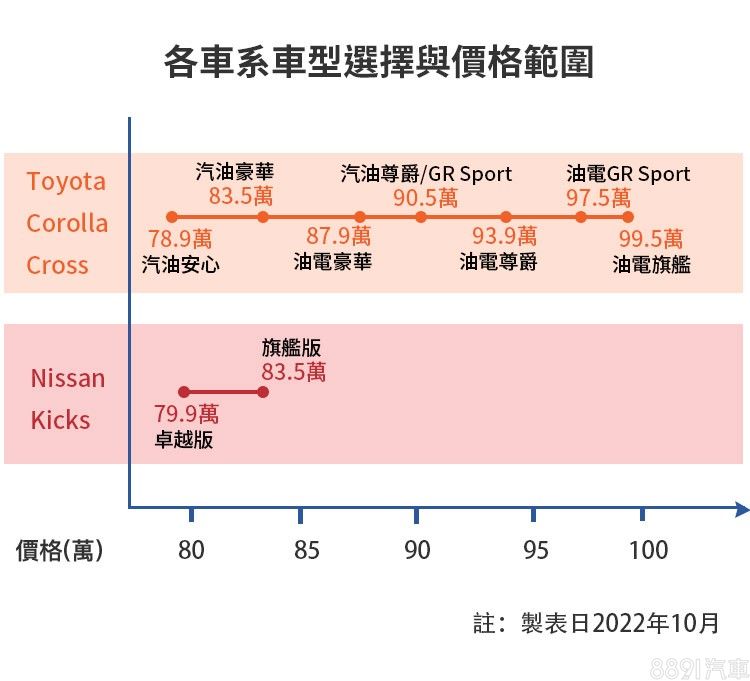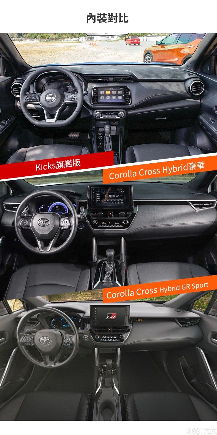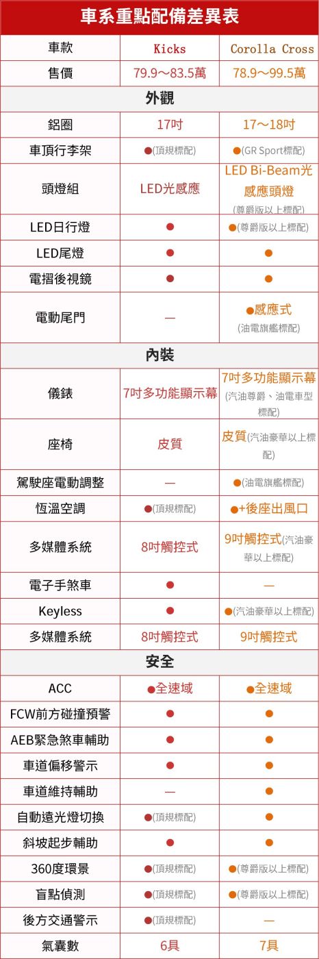 兩車配備乍看差異不大,但Kicks入門款79.9萬便享有相對完整的標準配備,升級旗艦款主要增加自動遠近光燈、環景影像、盲點偵測等科技安全配備;Corolla Cross「用車價區分配備」的產品分級較鮮明,諸如LED頭燈、7吋數位儀錶、環景影像、盲點偵測等配備要買到90.5萬汽油尊爵才有配置,電動尾門、駕駛座電動調整等更是得到頂規油電旗艦才有配置,相比之下Kicks顯然較具C/P值。