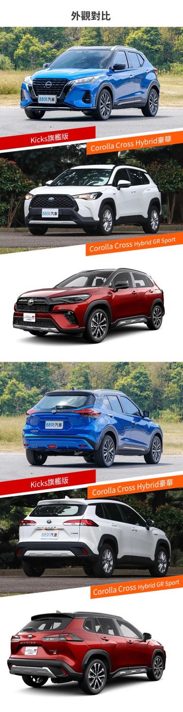 小改款Kicks在外觀細節較為用心,利用不同材質堆疊細部質感,Corolla Cross則明顯較為樸素,缺少這類細節點綴,不過GR Sport車型則另當別論,專屬外觀與18吋鋁圈帶來運動氣息,比標準版好看許多。另外,Kicks全車系標配LED頭尾燈,Corolla Cross得到尊爵版才列為標配,外觀明顯是Kicks較有誠意。
