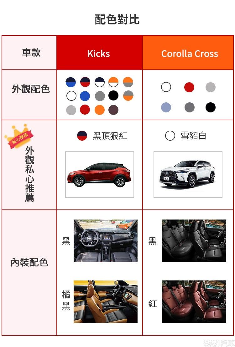 外觀配色Kicks較為年輕多變,除了基礎單色之外,也提供雙色車身選擇,其中個人最喜歡「黑頂狠紅」,搶眼又有質感。Corolla Cross車色選擇較少,雖然也提供紅、藍兩個較吸睛的選項,但變化性比較不足。內裝方面,Corolla Cross紅色內裝視覺效果出色,搭配白色車身是筆者最喜愛的經典搭配。