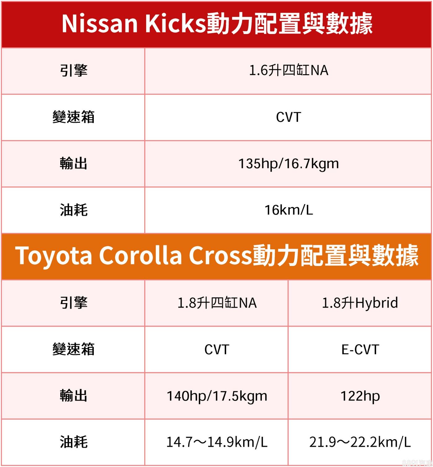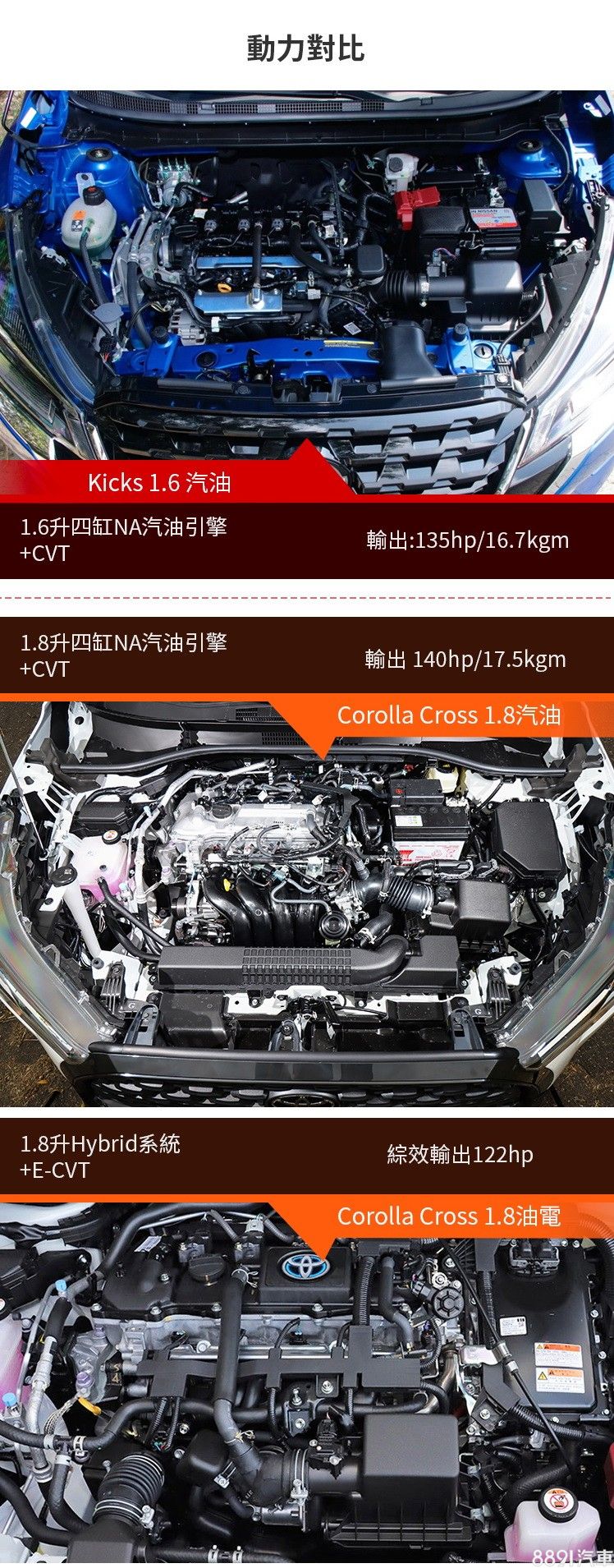實際將兩車動力數據對比,Kicks雖然排氣量比Corolla Cross的1.8升略小,但動力表現卻相當接近,能源局油耗16km/L也比Corolla Cross出色;不過比油耗當然比不過Corolla Cross油電,輕輕鬆鬆突破20km/L的數據正是油電動力最大亮點。
