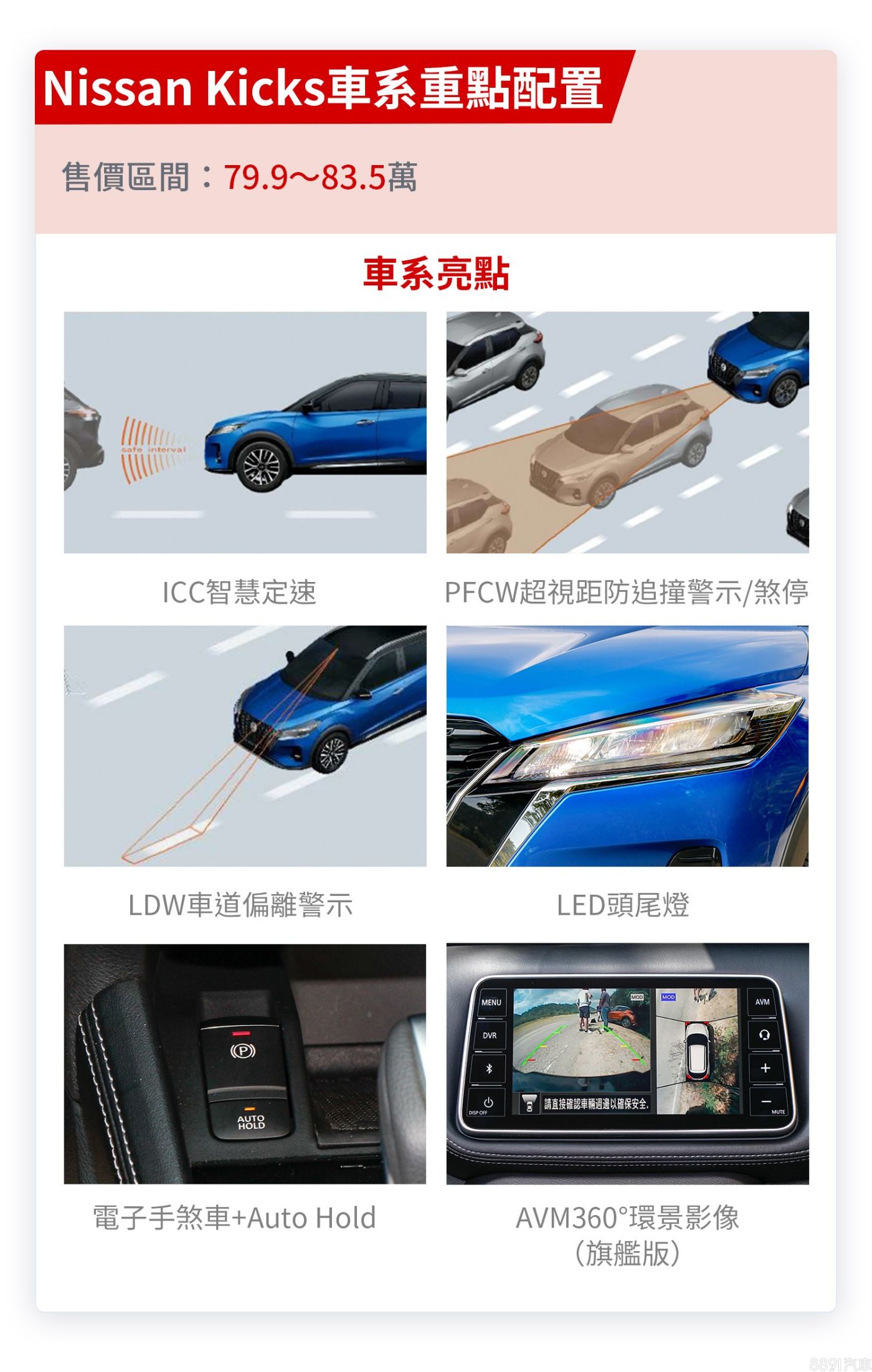 小改款Kicks補齊全速域ACC、加入電子手煞車與Auto Hold,還有LED頭尾燈與Apple CarPlay、Android Auto等日常實用配備,只要79.9萬就能入手極具C/P值。然而若沒有太多的預算壓力,強烈建議升級旗艦版,環景影像、盲點偵測不僅更安全,還有恆溫空調、車頂行李架、自動遠近光燈等配備,這些不僅事後難以改裝,配備價值更遠超3.6萬價差,絕對划算!