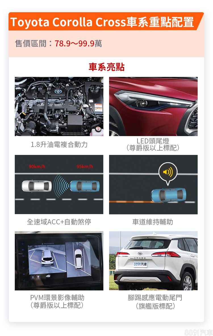 Corolla Cross最大的亮點在同級唯一油電動力,超過20km/L的平均油耗與寧靜駕乘感受相當有魅力,配備方面標配全速域ACC與自動煞停等駕駛輔助,且相較Kicks還增加車道維持,達到Level 2半自動駕駛等級。但除此之外,入門等級Corolla Cross配備較為陽春,想要LED頭燈、環景影像等配備就得多加預算才行。
