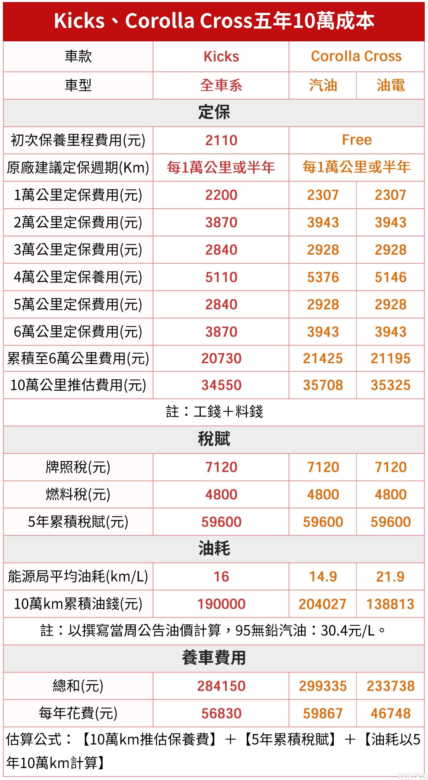 兩車保養費用十分接近,行駛10萬公里都要花費約3.5萬元進行保養,稅金級距也完全相同,使用成本差異最大在油耗表現,平均油耗最佳的Corolla Cross油電版平均每年花費僅4.67萬元,跟汽油版、Kicks有著約1萬元差異,Kicks花費5.68萬元居次,Corolla Cross汽油版消費最高來到5.98萬元。簡單來說,Corolla Cross油電省油優勢鮮明,至於汽油版與Kicks的用車成本則沒有太多差異。