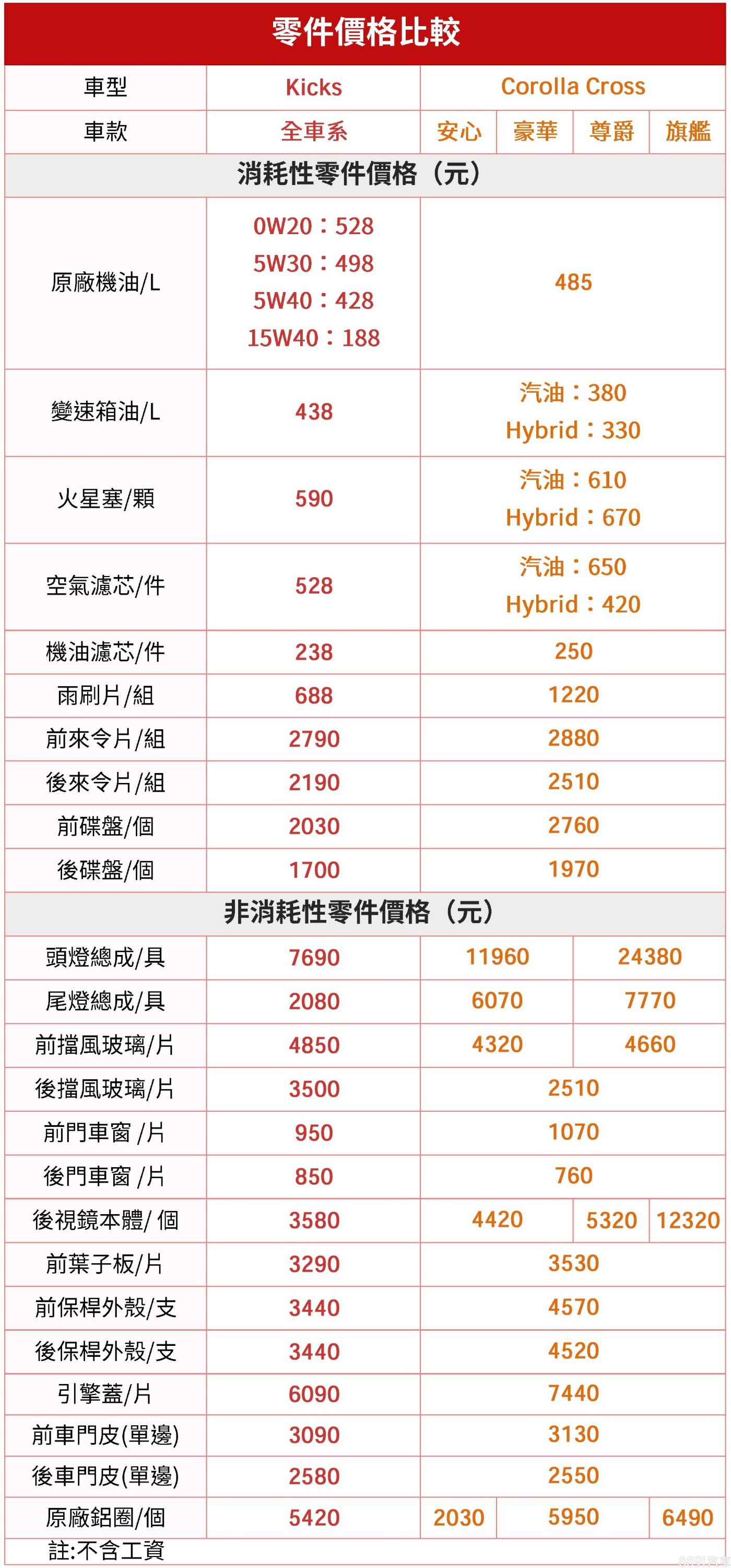 零件價格部分,兩車消耗性零件價差不大,其中較特別的是Kicks提供多種番號原廠機油供選擇,最基礎的15W40每公升價格僅188元,相當實惠。非消耗性零件方面,最常發生碰撞需更換的前後頭燈、前後保桿、後視鏡等零件,Kicks擁有顯著的價格優勢,Corolla Cross在零件成本上便普遍較高。