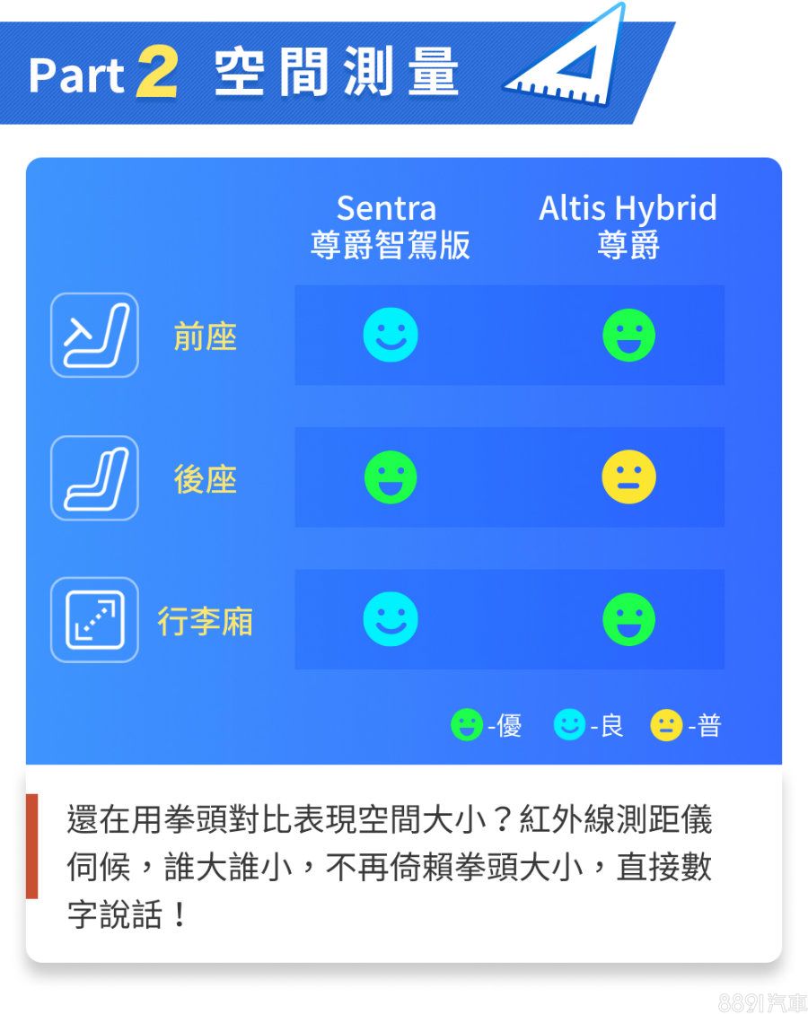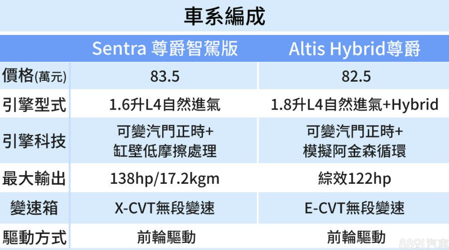 Altis車系總共有9種版本,就價格來說,和Sentra 尊爵智駕版最接近的其實是一般1.8升汽油的GR車型(82.8萬元),但加上家庭房車路線的考量,Altis Hybrid尊爵在產品調性上更貼近Sentra 尊爵智駕版,彼此間的價差也僅有1萬元,兩車最大差異就是動力系統了,Sentra採用新世代的1.6升引擎,訴求順暢、節能,有可能匹敵豐田招牌的Hybrid動力嗎?