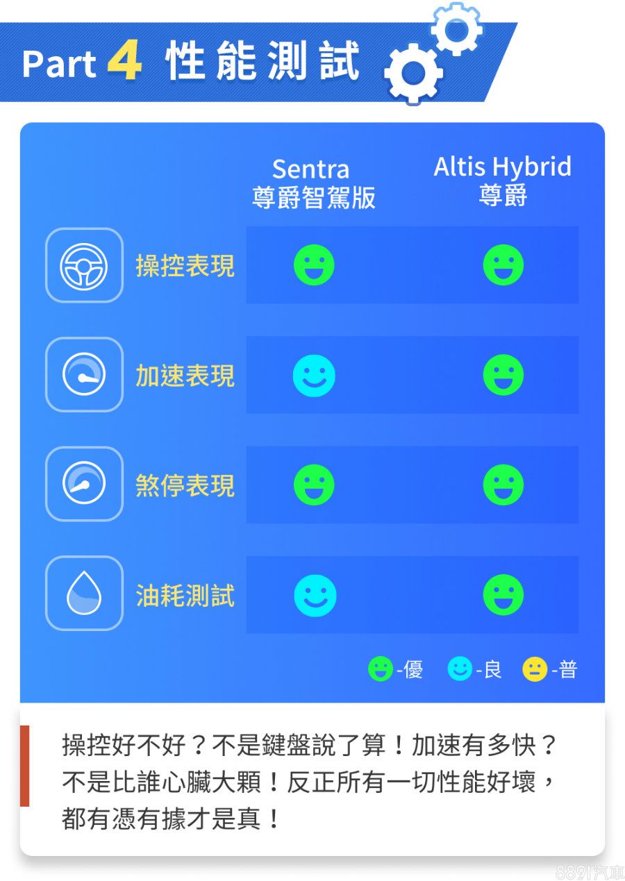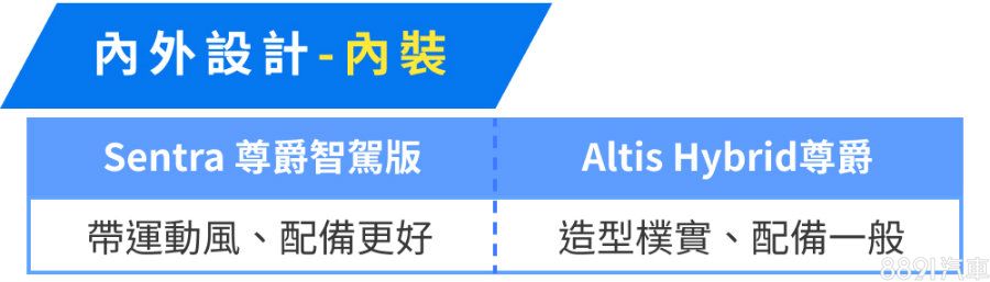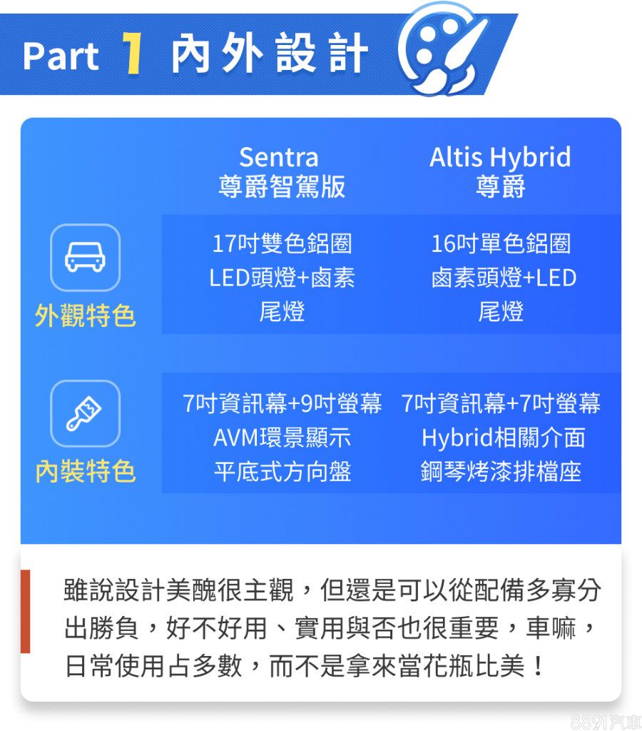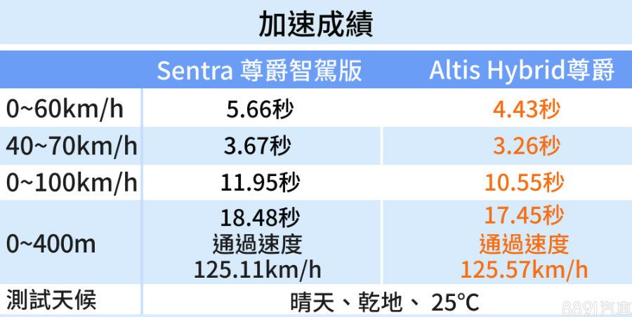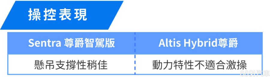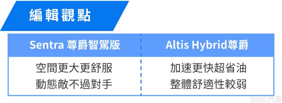 動力數據上,雖然Sentra的排氣量較小,但138hp/17.2kgm仍勝過Altis Hybrid的的122hp(綜效馬力),另外一方面,Sentra 尊爵智駕版的車重為1285kg,也比Altis Hybrid尊爵的1390kg輕盈不少,先天條件看來較有優勢。