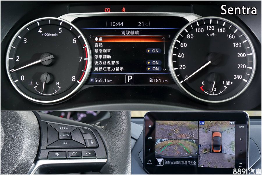 Sentra在數位介面表現上更豐富,9吋螢幕比對手更大之外,顯示清晰度、流暢度都更好,功能還多出環景攝影系統、無線Apple CarPlay;螢幕中央則採7吋資訊幕,除基本車輛資訊檢視外,駕駛輔助系統也能由此設定。Sentra全車系標配ICC主動跟車系統,方向盤右側能設定車距、時速等。