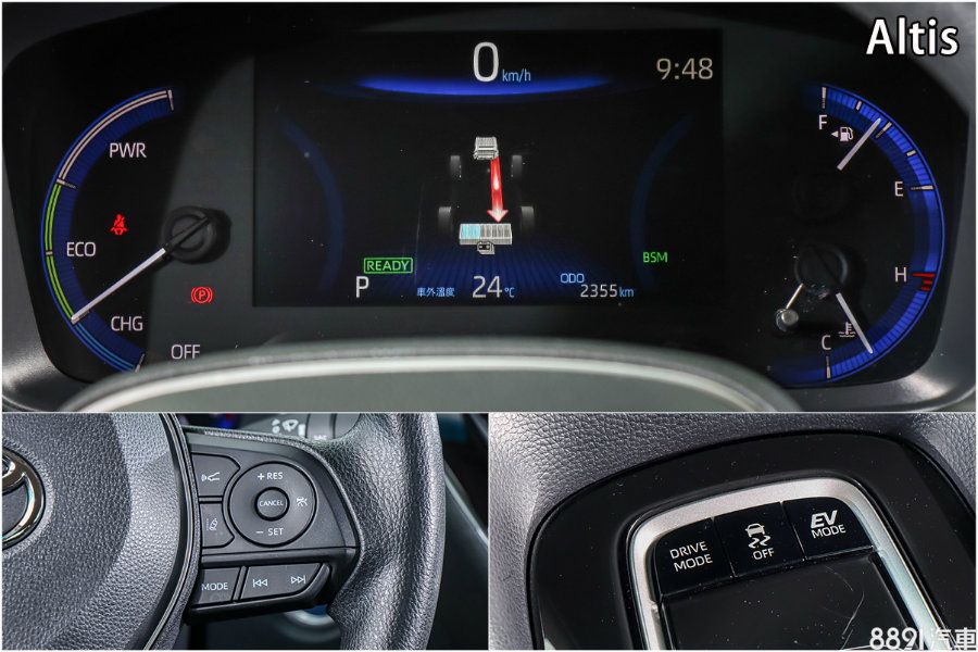 油電動力是Altis一大優勢,車內當然也能見到專屬配置,像是7吋儀錶便可顯示當下動力流狀態,讓駕駛更容易拿捏動力,達到省油效果,排檔座前有EV Mode、駕駛模式可供切換。主動跟車和對手一樣從右邊操作,用起來簡單直覺。
