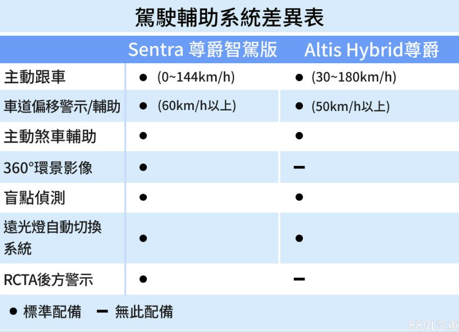 兩者顯著差異在於主動跟車條件,Sentra全速域ICC可支援跟車到停、低速跟車,Altis則非全速域;Altis想要環景影像輔助得上油電旗艦才有,RCTA後方警示則是全車系皆無,對比起同價位帶的Sentra略遜一籌。
