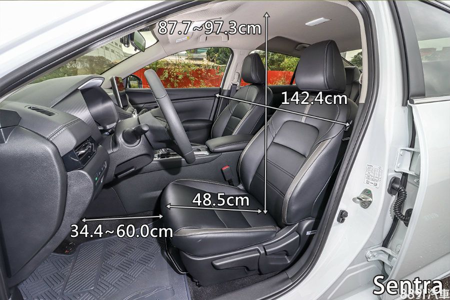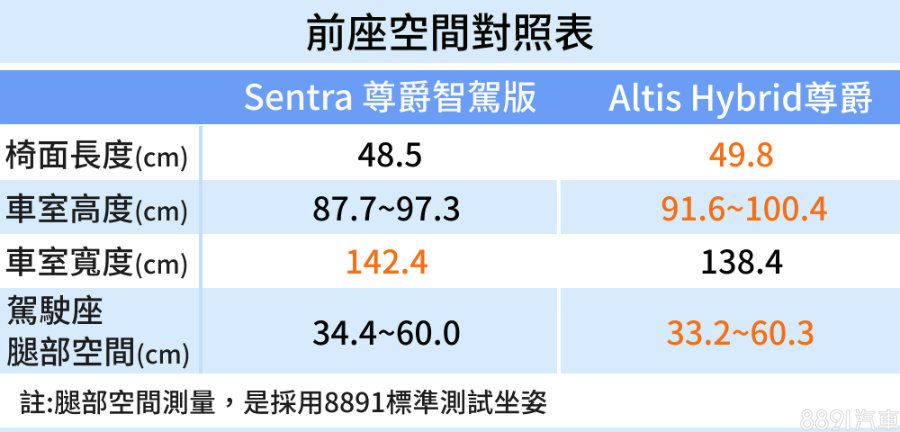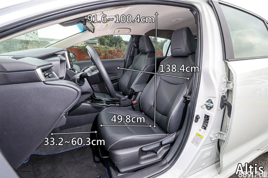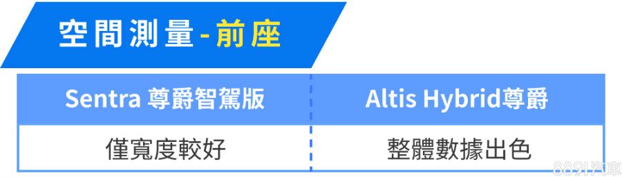 Sentra身形比例看起來較為寬扁,此點也反應在前座數據上,前座頭部數據略輸Altis,但寬度較佳。至於體感上來說,雖然兩者同為黑內裝、淺色車頂,但Sentra中控台較低,感覺起來也更開闊些。