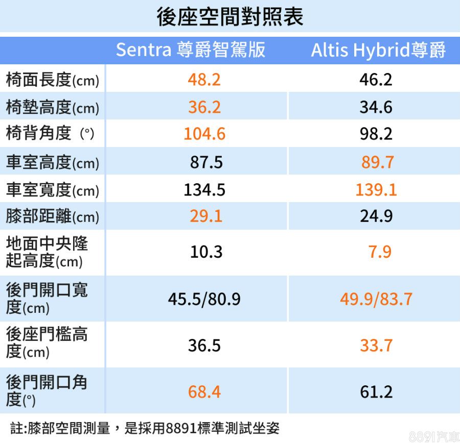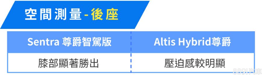 對比Sentra,Altis椅背角度略為挺直,大腿支撐性也差了一些,平心而論Altis後座舒適度已屬理想,不過在同場對比之下確實略遜於Sentra。