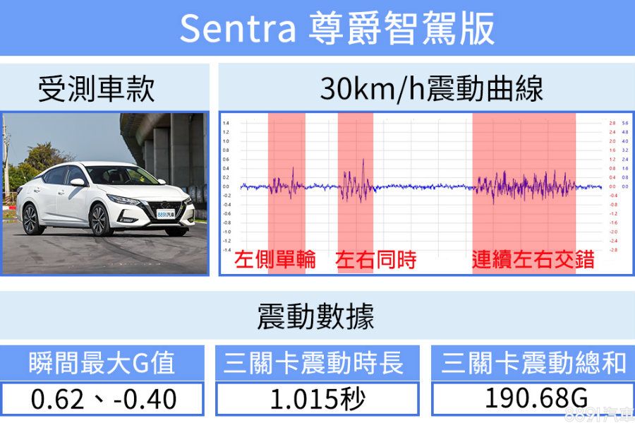 Sentra扮相運動風,懸吊支撐性也更好,但震動測試反而比Altis更舒適,以實測結果來看,不論是最大G值、總和都小於Altis,車身回穩速動也快速。