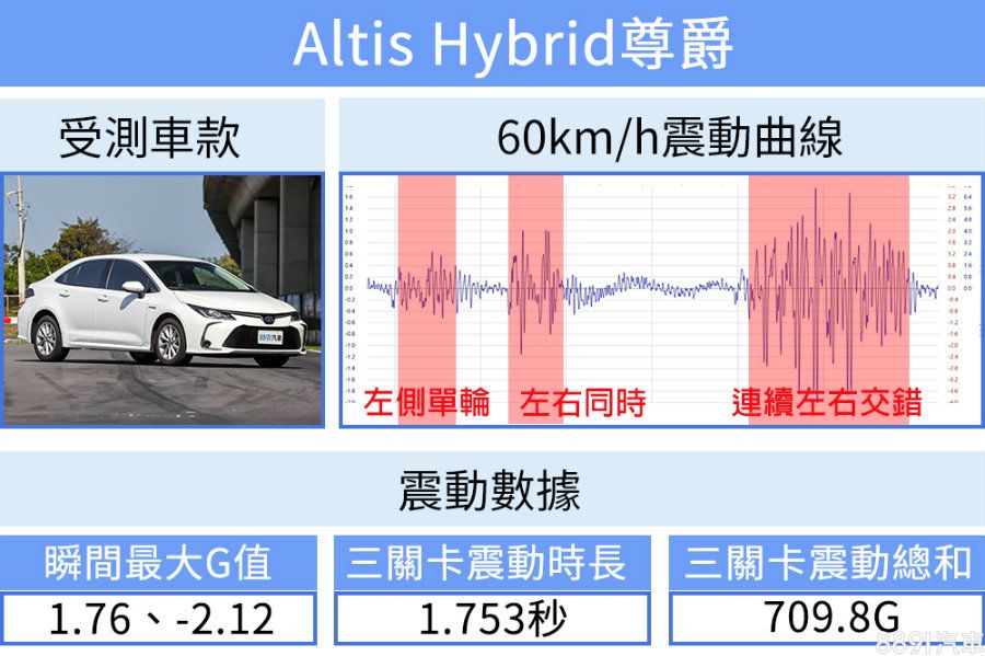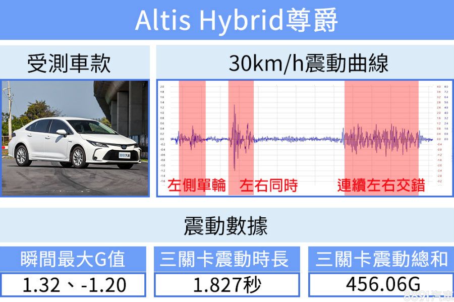 Altis Hybrid路感則更鮮明些,以震動圖形來看,該懸吊設定在低速時,不善於處理左右同時陣形,套用在一般道路行駛,就是經過橋接縫、減速坡時衝擊感會更明顯,同時懸吊回穩速度慢,也讓G值總和來到456.06G。