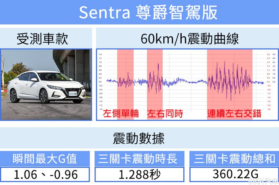 隨車速增加到60km/h,Sentra的衝擊感也相應增加,但車身通過陣仗穩定性依舊出色,從波形來看就像是30km/h等比例放大,工整又平穩。