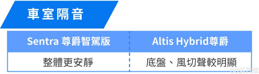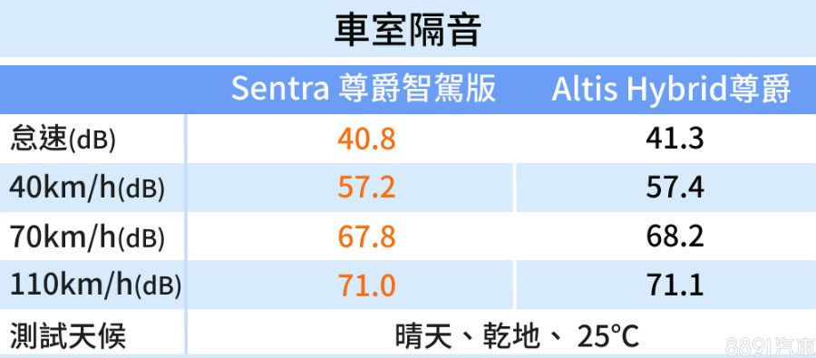 Altis Hybrid以引擎啟動的狀態進行測試, 主要是怠速時的風扇聲比對手來得明顯,而行進中的隔音表現都以些微差距輸給Sentra,實際感受上,Altis Hybrid對於風切聲和底盤噪音的隔絕性確實較弱。