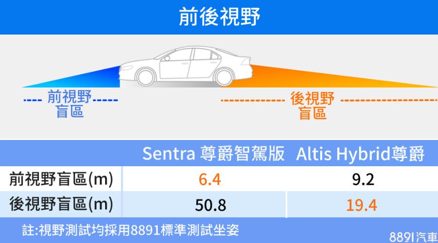 Sentra車尾腰線較高,尾窗也更傾斜,使後視野一舉來到50.8m,不只輸Altis,在歷來超測中也是後段班,所幸配有環景輔助及RTCA後方警示,讓停車多一分安心;至於Altis的問題是中控台設計較高,讓前視野遜於對手,後方19.4m則符合同級水準。