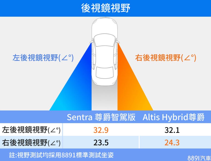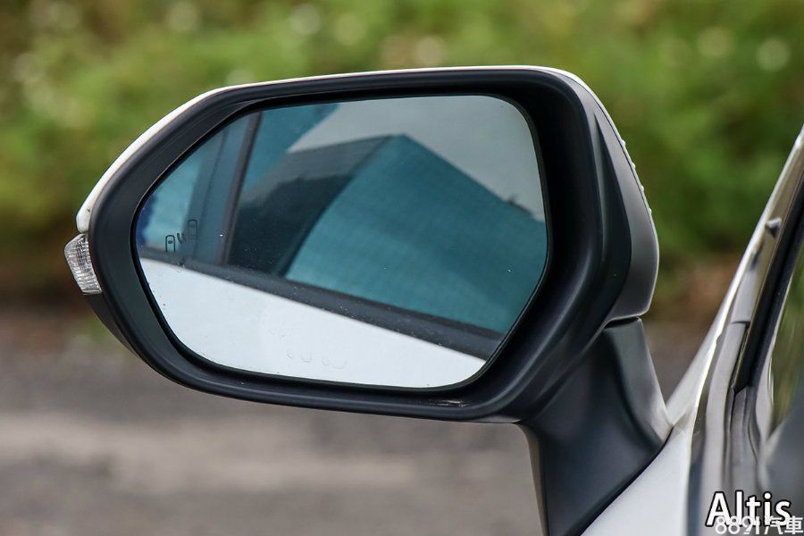 後視鏡廣度兩者表現相仿,皆是右側明顯小於左側,也都無廣角鏡設計,在後視鏡造型來說Altis稍為較對手向外延伸,多少有助於增加廣度。在視野之外,兩輛都配有盲點偵測系統,可確保車側視野死角安全。