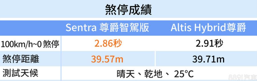 在好天氣條件下,兩者都是家庭房車,實測煞停距離皆屬一般,但一般路上開煞車腳感有別,Sentra初段制動力較為直接,駕駛須習慣下踩踏力道,低速時較不易點頭;Altis Hybrid雖煞車有動能回收機制,但制動力道反而比Sentra更線性,煞車踩踏深度更好拿捏。