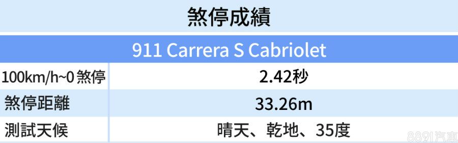 這輛911剎車系統為標準配置,並沒有選配PCCB碳纖維陶瓷剎車系統,但別這樣就質疑911剎車表現,在麗寶賽道進行單圈測試時,制動力給人的信賴感相當高,犀利且線性好掌控,這樣的特性,讓人不太需要擔心煞停測試,100km/h使盡全力踹下剎車踏板,911 Carrera S Cabriolet極為穩定的減速至靜止,取得距離只要33.26m超優異成績。