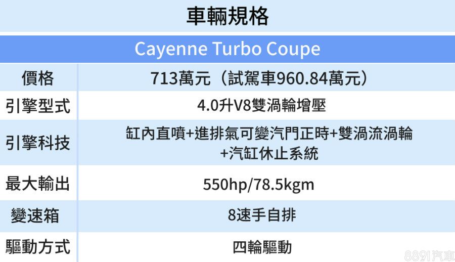 入手保時捷除了對跑車品牌的迷戀,理所當然也對性能有所追求,Cayenne Turbo Coupe便在豪車基礎上注入品牌最擅長的高性能表現,0~100km/h加速4.15秒、零四12秒台實力堪比超跑等級,即使嚴苛的麗寶賽道也能以1.7秒差距緊追當家跑車911,身手強悍自是不言而喻。只不過此等身手代價並不低,包含內外選配、這輛試乘車的總身價可是來到近千萬(960.8萬),具備全能身手似乎也顯得合情合理。