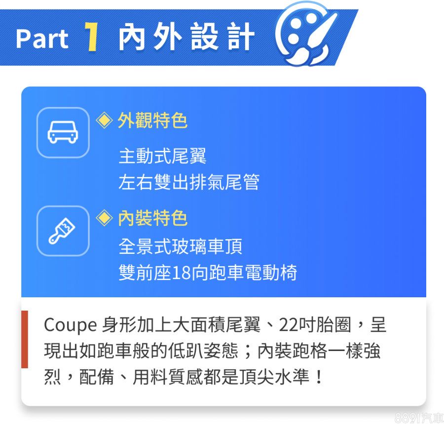 Cayenne Coupe與Cayenne的視覺差異,主要在於車身後半部,車高降低20mm、車寬增加18mm,A柱角度更加低斜、C柱更加後滑,同時拿掉了車頂行李架,型塑更為低趴的跑格線條。試駕車款秉持著保時捷「選好選滿」的理念,全車選配價將近260萬,外觀部分額外選配隔熱隔音私密玻璃(10.99萬)、高亮澤銀色窗框(1.44萬)、前後保桿不鏽鋼護板(7.2萬)、越野套件(11.37萬)等,另外矩陣式LED頭燈也升級具主動轉向照明的PDLS Plus(9.74萬)。