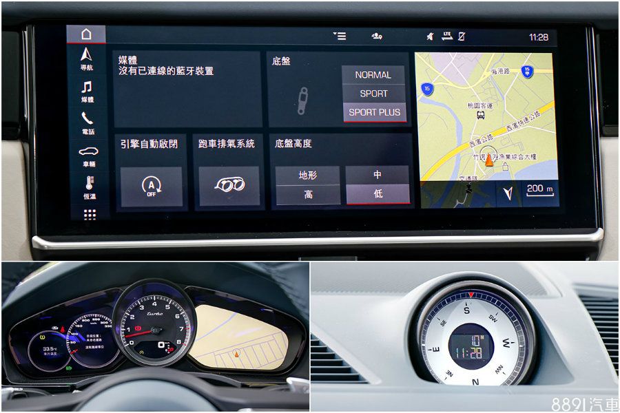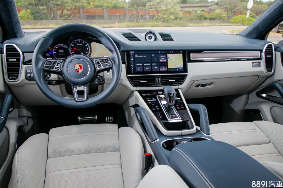 內裝鋪陳基本與Cayenne相同,儀錶板雖採傳統的五環顯示,但左右兩側分別設置一個7吋顯示幕,中控台則搭載一具12.3吋觸控螢幕,功能齊全、自主性也高,此車因選配越野套件,上方的跑車計時套件碼錶改成羅盤呈現,並且另外加價2.2萬元改成白底色。