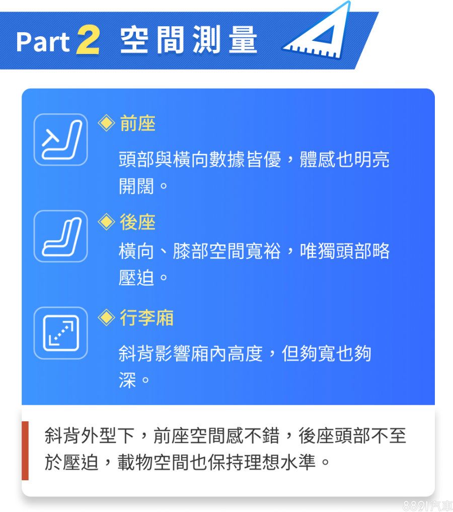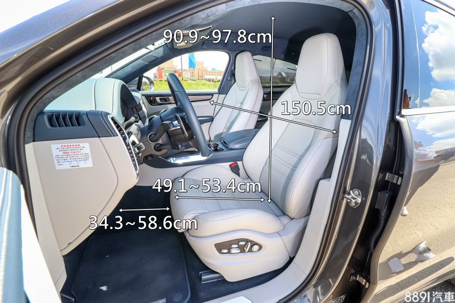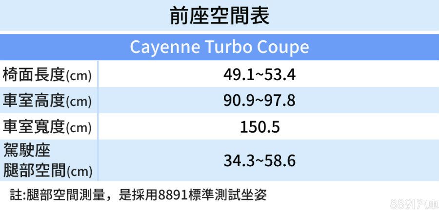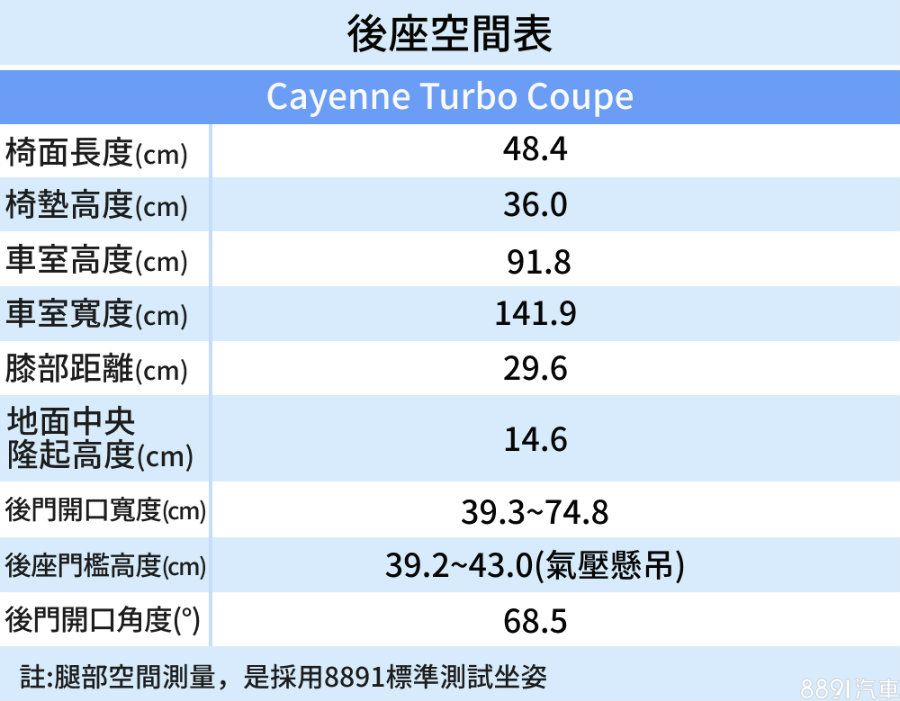 Cayenne Coupe在跑旅身形之下,並不犧牲前座空間表現,除了擁有150.5cm的橫向寬度外,在座椅調至最低情況下,能有97.8cm的頭部空間,以體感來說就是中大型休旅的開闊感。內裝設計重跑格,中控、排檔座都較高聳,但試乘車藉由白內裝來提升明亮度,也能有效放大空間感。