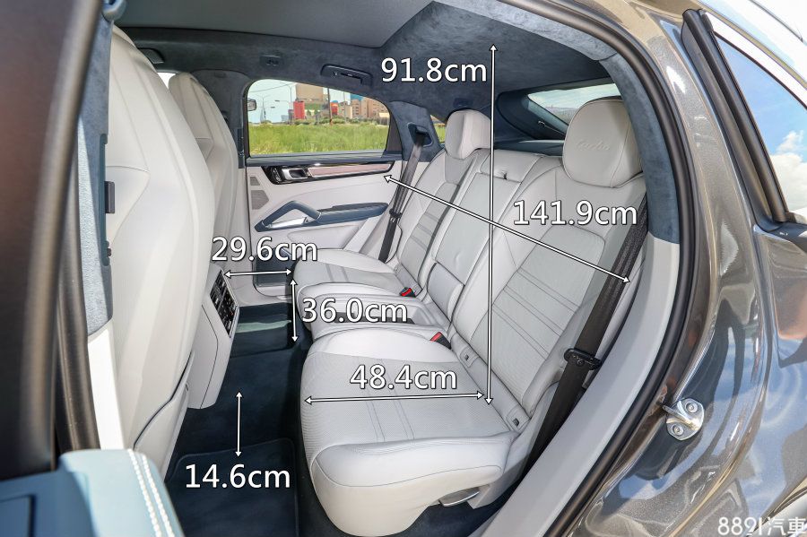 後座空間是類Coupe車型的硬傷,但Cayenne Coupe身形夠大,就算車頂削去一截,實測也能有91.8cm的頭部數據,就是與中型SUV差不多的水準,相信多數人都夠用了,加上開闊的橫向、膝部空間,坐起來自在舒適。另一個優點是採光良好,側窗面積不小輔以全景天窗加持,與前座同享明亮空間感。