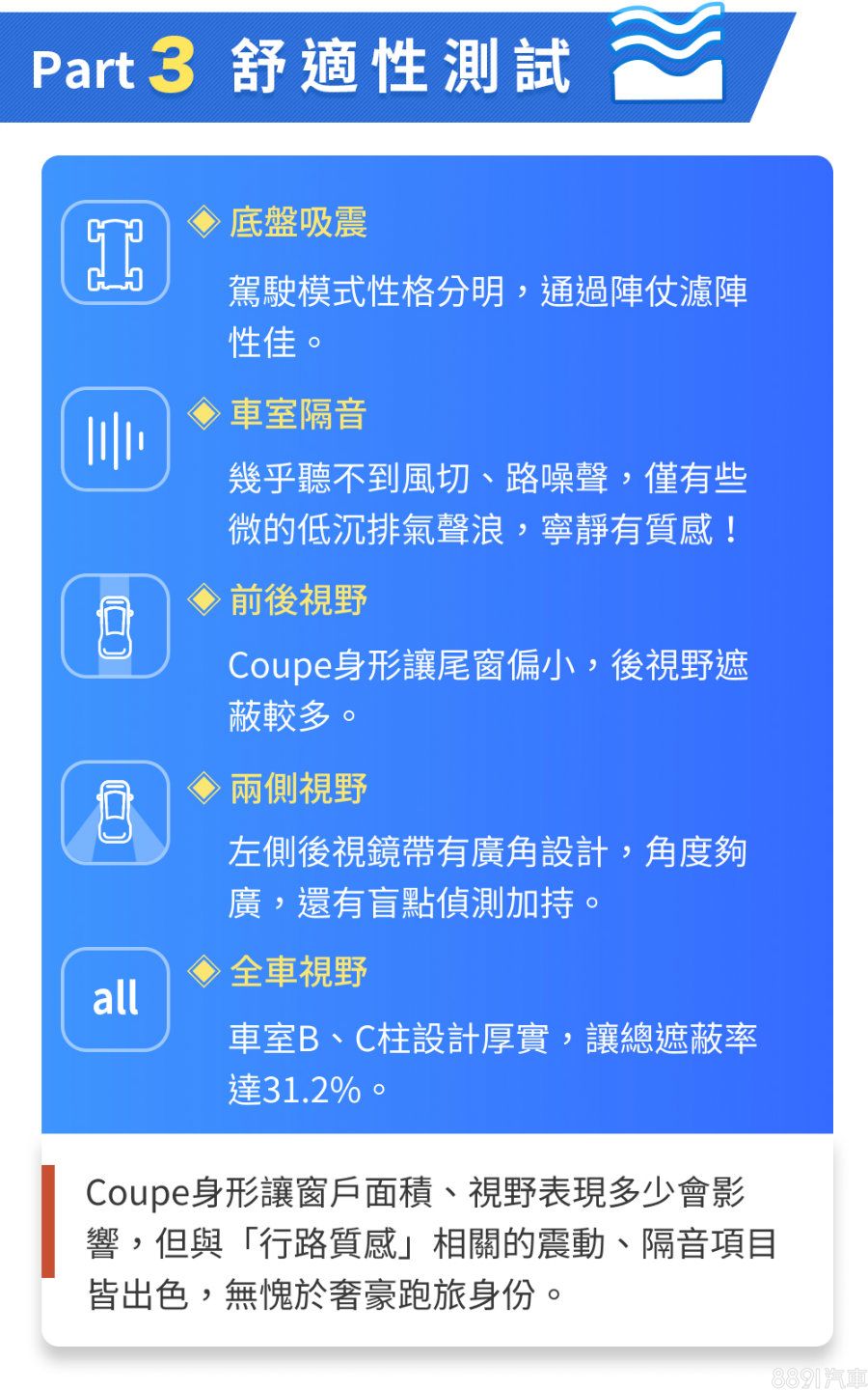 除了性能方面的亮眼表現,Cayenne Turbo Coupe在家用層面詮釋得相當到位,座艙空間出色、行李廂容積也拜車體龐大之賜能滿足多數日常需求,電子阻尼與氣壓懸吊更帶來柔韌舒適的行路質感,因而在震動測試表現亮眼。更別說大量選配所堆疊而成的細膩質感與霸氣外型,都讓Cayenne Turbo Coupe展現豪車所應有的氣息。