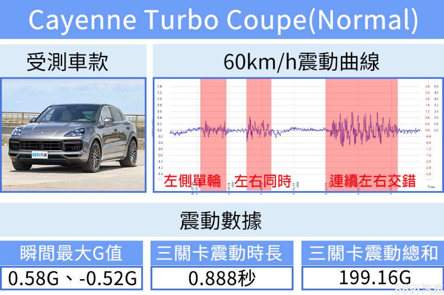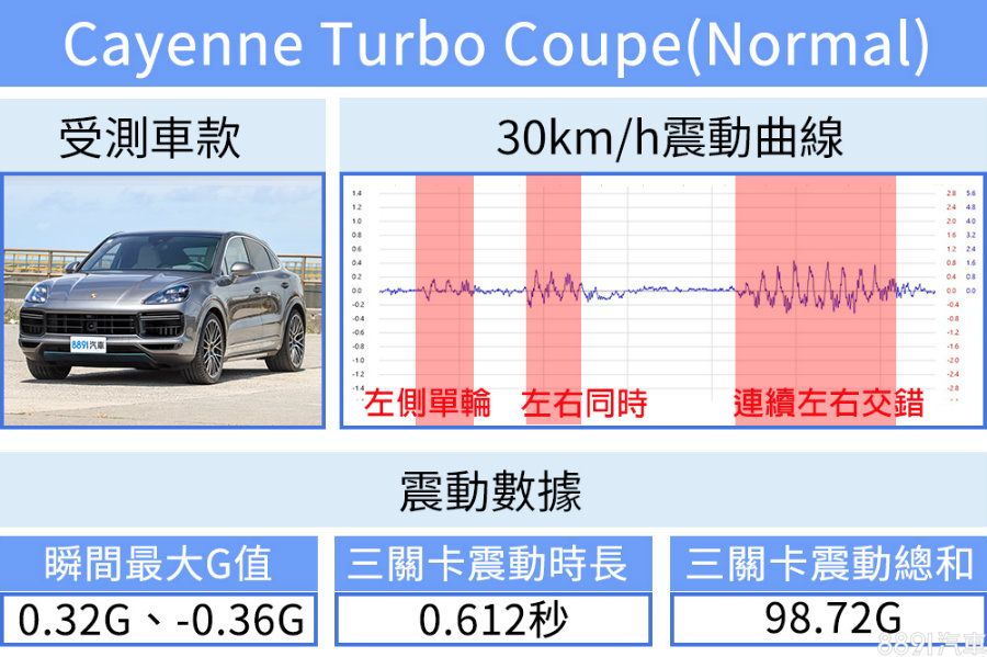 這輛Cayenne Turbo Coupe試駕車底盤可說是選好選滿,除了有電子避震之外,還有PDCC主動防傾桿功能,在Normal模式下顧名思義就是符合日常需求,懸吊柔軟吸震性佳,通過左右陣型時也沒太多晃動,震動總和僅有98.72G,屬相當優異的表現。
