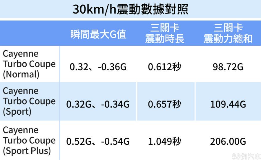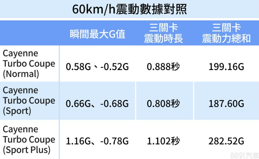 三關卡G力總和:在車速、計算區段都相同的情況下,把同一段時間裡的震動值相加,若總值愈小,代表吸震性佳,需特別說明的是,這總和值不代表總受力,而是希望大家較容易理解且能相互對比的數據。