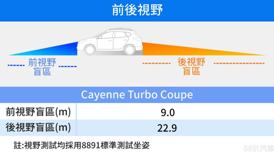 跑車化的身型及向後延伸的車尾線條,均讓尾窗角度過於傾斜,進而影響了後方的可視程度,前方視野表現以龐大身形來說卻算優異,主要是因為Cayenne Turbo Coupe擋風玻璃與A柱較Cayenne 扁平,再加上儀錶台高度適中,前方視野還算開闊。