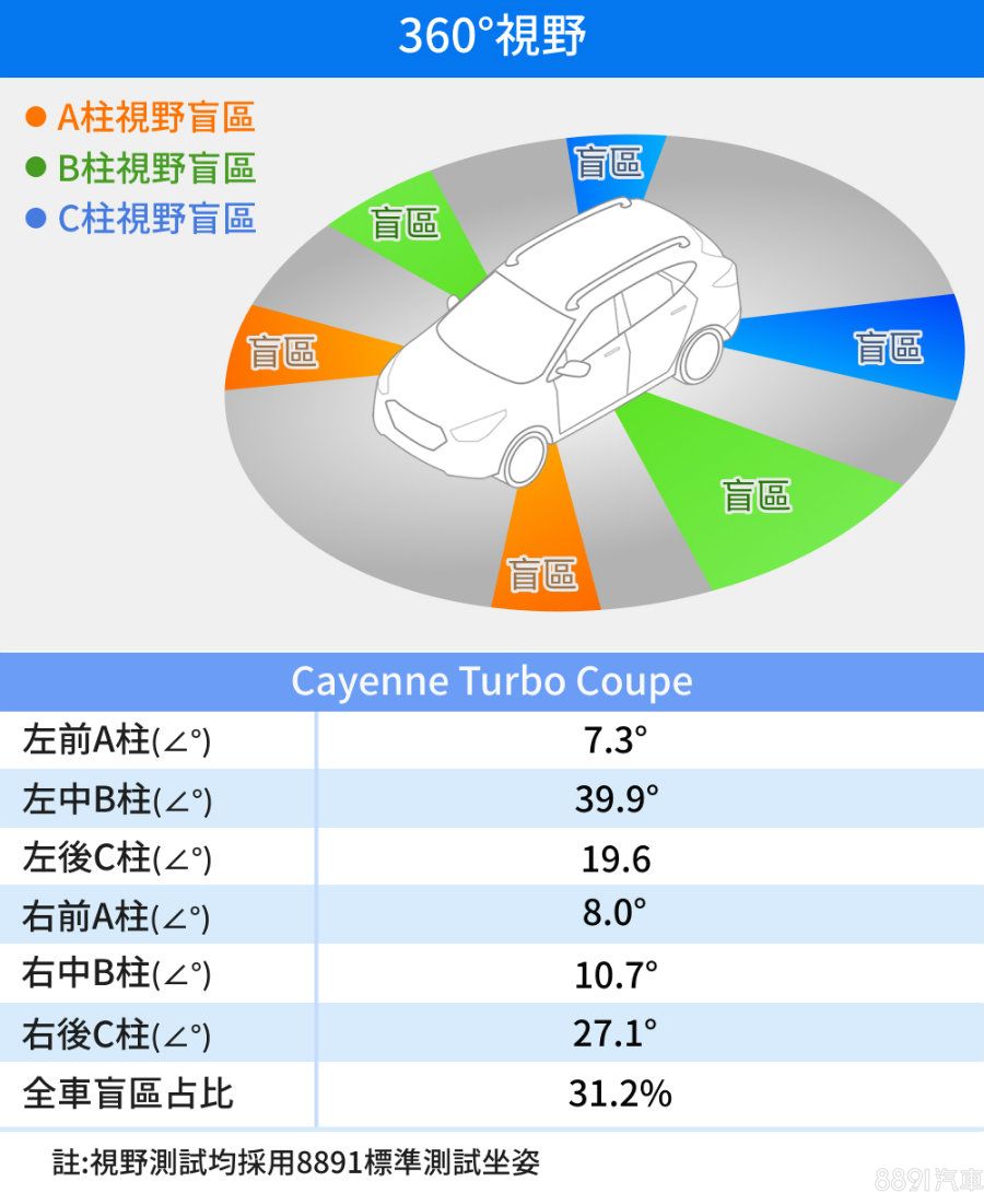 雖然前向的視野以休旅來說表現不算太差,但畢竟Cayenne Turbo Coupe身型還是「類跑車」,厚實的B、C柱及偏高的腰線,還是會影響視線,不過試駕車選配360度環景影像輔助,穿越巷弄或停車時或許可以放心不少。