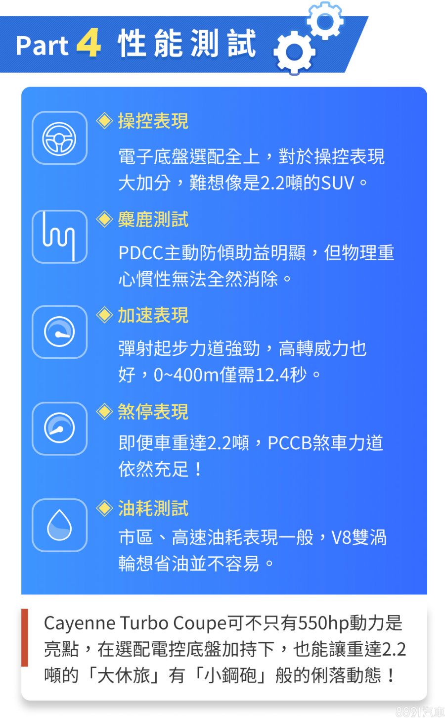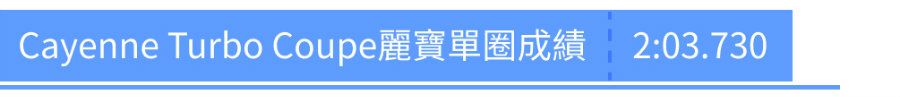 4.0升V8雙渦輪引擎擁有550hp/78.5kgm輸出,雖然數據在高性能SUV裡頭不是最猛,但驅策2.2噸車身也依舊帶勁,而因應Cayenne具備高度越野能力的底子,變速箱採用8速手自排,並非PDK系統,若換檔追求電光火石,自然還是PDK莫屬,但以液壓自排的標準來看,Sport Plus模式下的換檔動作相當直接迅速,使550hp/78.5kgm動力可以盡情釋放,讓人相當滿意,,最後Cayenne Turbo Coupe在麗寶大圈場地(23個彎道)的單圈紀錄是2分03.730。