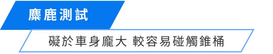以71km/h進入陣仗,可以看到第一個左閃避的動作頗為俐落,完全無視2.2噸的超重份量,而進入第二車道時,後輪有偏滑,讓車尾頗貼近錐桶,不過整個車身動態仍相當流暢,順利的通過陣仗。