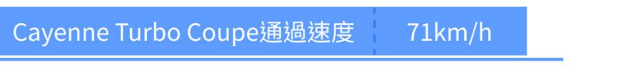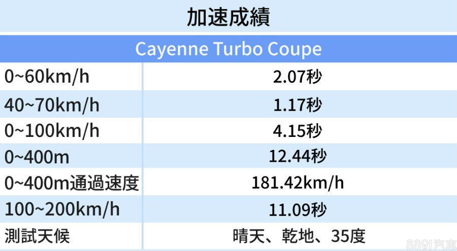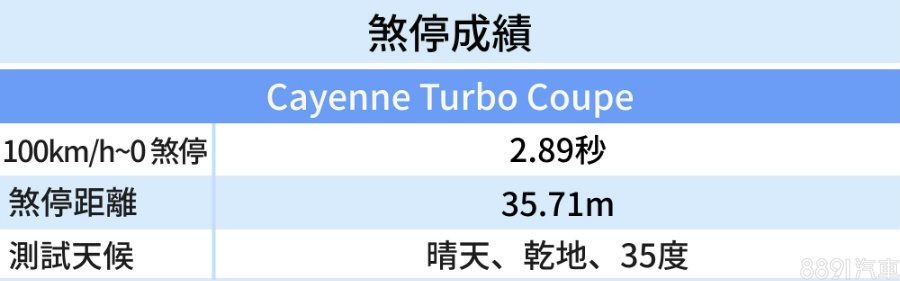 雖然不能像PDK變速箱能實現高轉速彈射而出的動作,但Cayenne Turbo Coupe依然具備Performance Start功能,以原地增壓至1.3bar、引擎轉速2000rpm的狀態起跑,瞬間推背感還是頗為強烈,過程中的換檔反應也十分積極,最後0~100km/h加速成績為4.15秒,和原廠3.9秒有些微差距,炎熱天氣多少還是有影響,當天其他同場測試車輛也都有偏慢的狀況。