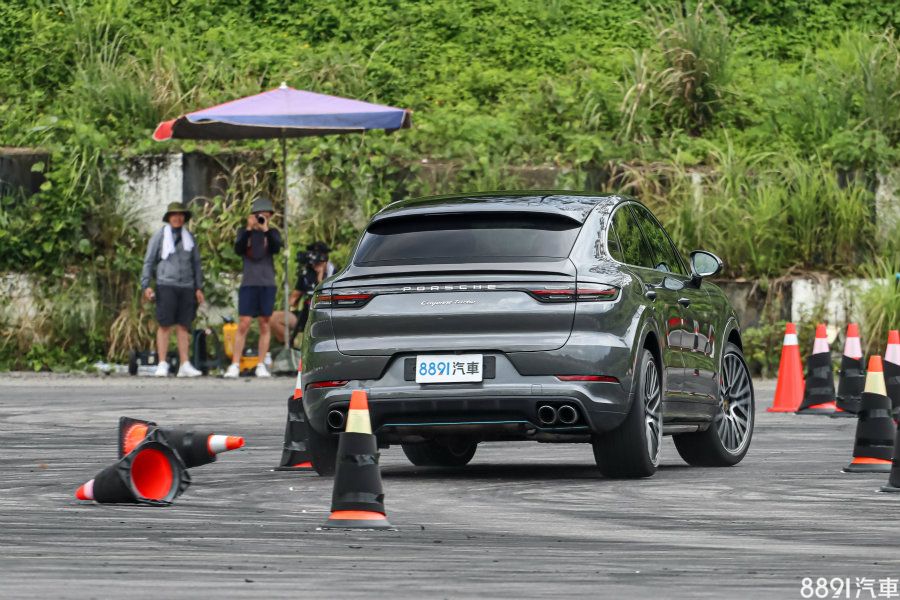 車速提高到72km/h,第一個閃避動作依舊俐落,但進入二車道的車尾滑動變多,加上Cayenne Turbo Coupe身軀較大,在車道寬度按照陣仗規範維持不變時,體型愈大的車,自然考驗更加嚴苛,也因此可以看出,Cayenne Turbo Coupe車尾到錐桶,而我們嘗試幾次,碰觸到錐桶的地方都相同,因此車速72km/h挑戰失敗。