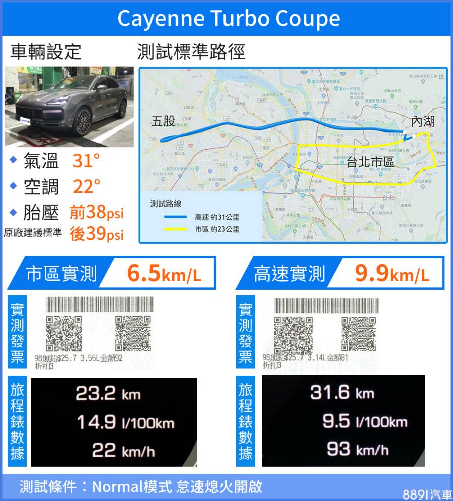 總長近54km的油耗測試路段,Cayenne Turbo Coupe設定於Normal模式、開啟怠速熄火進行施測,空調溫度固定設定於22度,並分別於高速及市區路段繳出6.5km/L、9.9km/L的能耗成績,雖說字面數據並非特別亮眼,但對於一款高性能休旅而言,仍稱得上具有相當水準之表現。