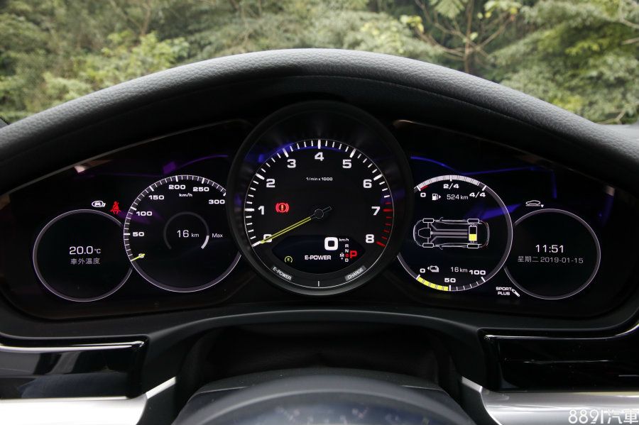 因應油電動力,轉速錶下方有電力輸出或動能回收指示,右方多工顯示幕也多了電能狀況圖,還有電力儲存量與純電行駛距離,而時速錶內也有一個顯示馬達出力狀況與純電續航力資訊。