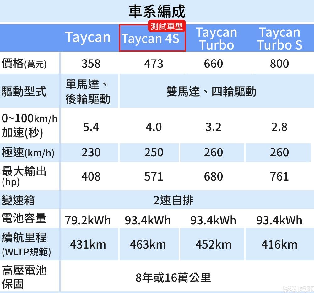 Taycan擁有四種車型等級,除入門版採單馬達、電池容量較少外,4S以上車型皆採用前後雙馬達、93.4kWh電池,再依照車型等級不同增加輸出。Taycan規格亮點不少,除了是首輛支援800V快充系統的電動車外,也在後軸馬達加入「雙速」變速箱,可優化高速衝刺延伸性,是一項為「跑車化」而生的新科技,更讓人期待Taycan 4S實測加速有何表現。